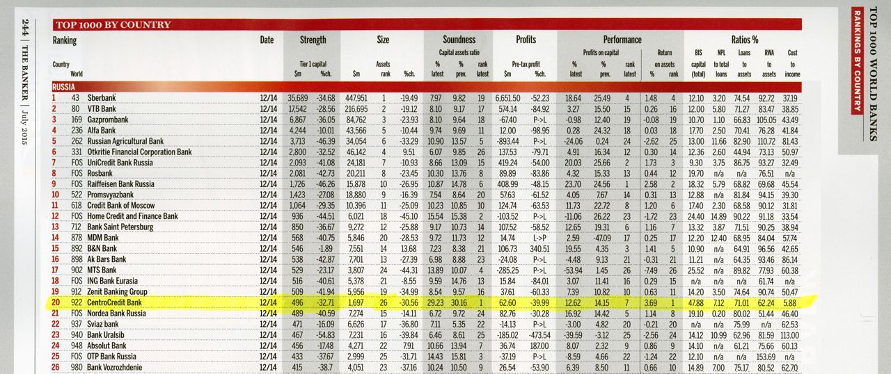 THE BANKER TOP 1000 WORLD BANKS RANKING: CentroCredit Bank is 922nd (20th in Russia)