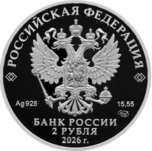 рельефное изображение Государственного герба Российской Федерации, над ним вдоль канта – надпись полукругом «РОССИЙСКАЯ ФЕДЕРАЦИЯ», обрамленная с обеих сторон сдвоенными ромбами, под гербом слева – обозначения драгоценного металла и пробы сплава, справа – содержание химически чистого металла и товарный знак монетного двора, внизу в центре в три строки – надпись «БАНК РОССИИ», номинал монеты «2 РУБЛЯ», год выпуска «2026 г.».