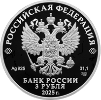 рельефное изображение Государственного герба Российской Федерации, над ним вдоль канта – надпись полукругом «РОССИЙСКАЯ ФЕДЕРАЦИЯ», обрамленная с обеих сторон сдвоенными ромбами, под гербом слева – обозначения драгоценного металла и пробы сплава, справа – содержание химически чистого металла и товарный знак монетного двора, внизу в центре в три строки – надпись «БАНК РОССИИ», номинал монеты «3 РУБЛЯ», год выпуска «2025 г.».