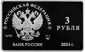 в левой части монеты прямоугольной формы – Государственный герб Российской Федерации, над ним – надпись полукругом «РОССИЙСКАЯ ФЕДЕРАЦИЯ», обрамленная с обеих сторон сдвоенными ромбами, под гербом слева – обозначения драгоценного металла и пробы сплава, справа – содержание химически чистого металла и товарный знак монетного двора, внизу – надпись «БАНК РОССИИ»; в правой части монеты в две строки – номинал в две строки «3 РУБЛЯ», внизу – год выпуска «2024 г.».