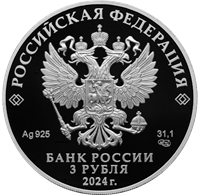 рельефное изображение Государственного герба Российской Федерации, над ним вдоль канта – надпись полукругом «РОССИЙСКАЯ ФЕДЕРАЦИЯ», обрамленная с обеих сторон сдвоенными ромбами, под гербом слева – обозначения драгоценного металла и пробы сплава, справа – содержание химически чистого металла и товарный знак монетного двора, внизу в центре в три строки – надпись «БАНК РОССИИ», номинал монеты «3 РУБЛЯ», год выпуска «2024 г.».