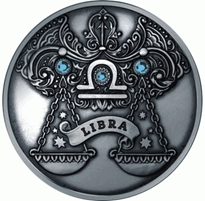 в центре – стилизованное изображение близнецов; внизу надпись: LIBRA; вверху – зодиакальный символ созвездия и вставки из кристаллов Сваровски