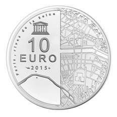 справа отштампована карта берегов Сены, на которых возведены вышеупомянутые сооружения, и названия этих зданий — «GRAND PALAIS», «INVALIDES». Слева стоит номинал — «10 EURO», год производства — «2015», знаки подлинности, логотип ЮНЕСКО, название платежного средства — «Paris, Rives de la Seine», а также русло реки, возле которого точками обозначены места расположения архитектурных памятников.