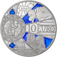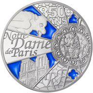 "Парижский монетный двор в рамках нумизматической серии «Всемирное наследие ЮНЕСКО» представил новую серию коллекционных монет, подготовленных к 850-летию с начала строительства Собора Парижской Богоматери. Обе стороны монет оформлены под витраж собора. Здесь мы видим центральный образ западного витража — Дева Мария с младенцем. В панелях, исходящих из этого центра выгравирована одна из скульптур мистического существа гаргульи, украшающих собор, а также западный фасад собора. На монете имеются полупрозрачные вставки из холодной эмали."