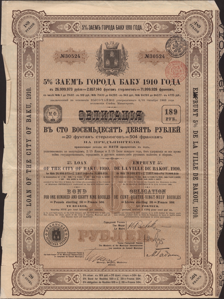 Облигационный заем города Баку, как и другие городские займы не гарантировались государством, а только имуществом и доходом самого города. Заем 1910 года для Баку не был первым, в 1895 году уже был оформлен заем под 3,5%. Стоит подчеркнуть, что, в силу интенсивного развития городского хозяйства, в начале XX века увеличились суммы городских облигационных займов: с 0,5-12,5 до 20-40 млн рублей. И заем города Баку вполне соответствовал данной тенденции.