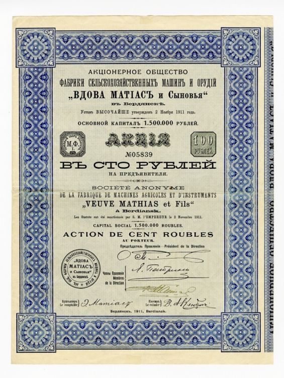 С началом аграрной реформы П. А. Столыпина рынок сельхозтехники стал стремительно расти. Производство сельскохозяйственных машин в Российской империи вышло на ведущие позиции в области машиностроения. Учитывая выгодную конъюнктуру рынка, семейное предприятие преобразуется в акционерное общество. В ноябре 1911 года «Акционерное общество фабрики сельскохозяйственных машин и орудий „Вдова Матиас и сыновья“ в Бердянске» получило Высочайшее утверждение. Его основной капитал составлял 1,5 млн. рублей, разделенных на 15 тыс. акций стоимостью в 100 руб. каждая. В предвоенные годы удалось расширить производственные мощности, увеличить количество работающих (более 300 человек). Завод имел все шансы для последующего устойчивого развития.