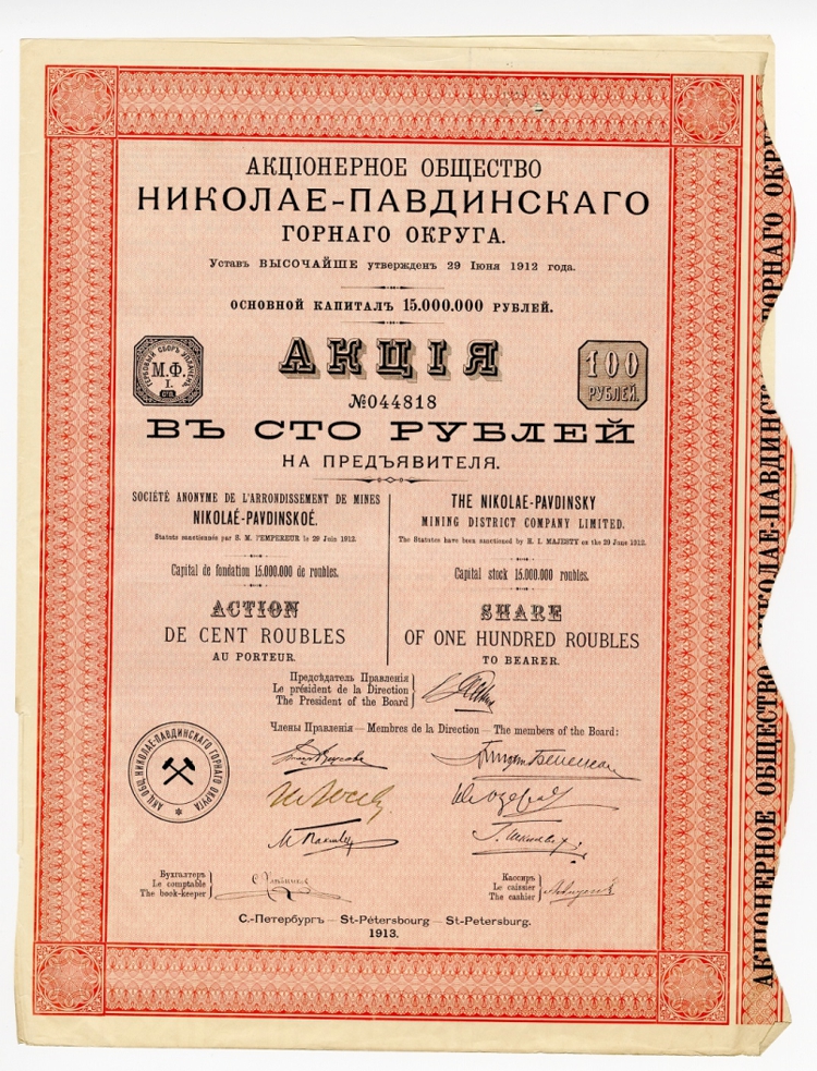 Очень скоро расчеты горнопромышленников подтвердились. Все земли округа, предлагаемые к добыче и к переработке сырья оказались под контролем новообразовавшегося акционерного общества Николае-Павдинского горного округа. Его Устав получил Высочайшее утверждение 29 июня 1912 года. В нем отмечалось, что общество создается для эксплуатации золотых и платиновых месторождений, а также для финансирования разработки добычи меди, никеля и железной руды.