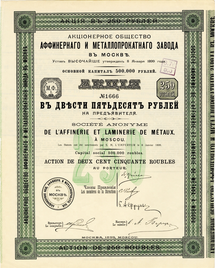 В конце XIX века существенно возрос спрос на цветные металлы, на золото и серебро. Большой интерес вызывали аффинажные производства по очистке металлов от примесей. Первое подобное производство было открыто еще при Петре I, на монетном дворе. А в 1899 году предприниматели Крайнис и Раскин организовали в Даниловской слободе (вблизи станции московского метро «Шаболовская») аффинерный и металлопрокатный завод. Строительство велось под руководством инженера-технолога Э. Розена.