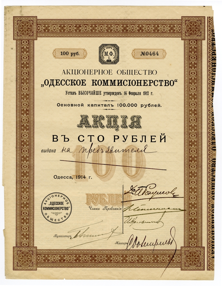 Акционерное общество «Одесское комиссионерство» было создано в 1912 году с уставным капиталом 100 тыс. руб., разделенным на 1 тыс. акций по 100 руб.