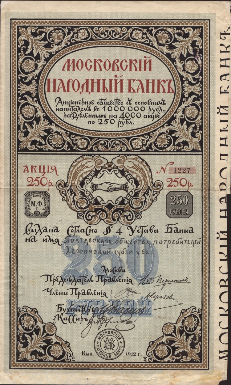 Среди учредителей Московского народного банка были – известный теоретик кооперативного движения Н.П. Гибнер, председатель комитета сельских сберегательных товариществ В.А. Перелешин, инженер-агроном П.А. Садырин, а также крестьянин А.П. Павлов, купцы А.Н. Балакин, А.Н. Анцыферов, Т.И. Буйнов и др. Основной капитал составлял 1 млн. руб., разделенный на 4 тыс. именных акций номиналом по 250 рублей. Примечательно, что эскизы акций банка создал знаменитый иллюстратор русских сказок Иван Билибин. Держателями акций были кооперативные союзы, а частным лицам принадлежало менее 16% (с 1916 года продажа им акций прекратилась). К 1917 году капитал банка увеличился до 4 млн. руб.