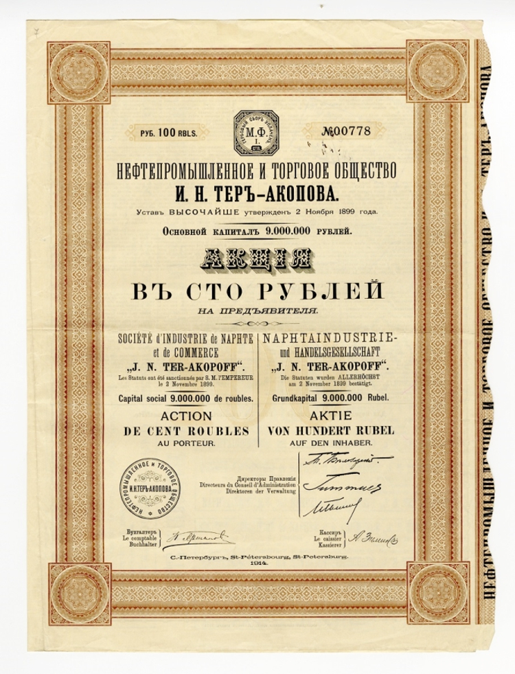 В 1899 года, после Высочайшего утверждения своего устава, приступило к работе «Нефтепромышленное и торговое общество И.Н. Тер-Акопова». Первоначальный основной капитал Общества Тер-Акопова составлял 4,5 млн руб. А накануне Первой мировой войны, в 1914 году в связи с расширением деятельности Общества посредством дополнительной эмиссии акций номиналом 100 руб. он был существенно увеличен и достиг уже 9 млн руб. Высокая доходность инвестиций благоприятствовала новому размещению акций.