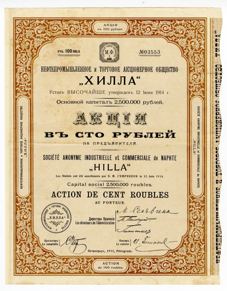 12 июня 1914 года был зарегистрирован устав «Нефтепромышленного и торгового общества «Хилла»». Его основная цель – разработка нефтяных месторождений Хиллинского района. Предполагалась также и последующая реализация добываемой и перерабатываемой нефтепродукции. Основной капитал образованного акционерного общества составлял 2,5 млн. рублей. Примечательно и то, что помимо нефти в Хиллинском районе планировалось развивать сопутствующие производства, в частности изготовление лекарственных препаратов из йода и брома. Правление Общества располагалось в Петрограде.