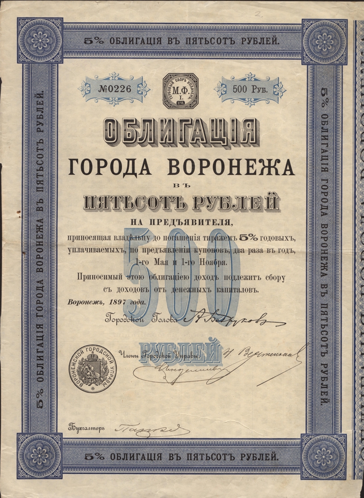В таких непростых условиях приходилось управлять городом Воронежскому городскому голове, купцу I гильдии Безрукову Алексею Николаевичу, избранному на этот пост в 1897 году, в возрасте 50 лет. В том же году городской голова инициировал выпуск городского облигационного займа на 49 лет под 5% годовых, с выплатой дохода по облигациям дважды в год – 1 мая и 1 ноября. Облигации номиналом 500 руб. выпускались на предъявителя. Средства от размещения облигационного заема были направлены на развитие города.