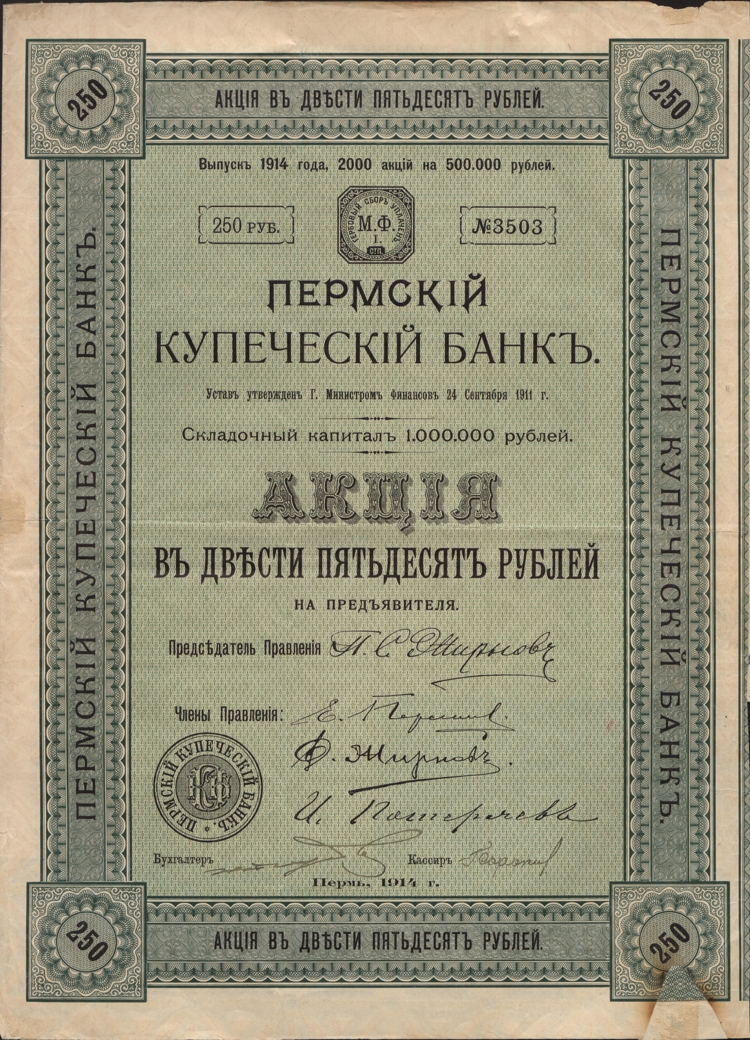 Акционерный Пермский Купеческий банк, образованный в 1912 году, являлся в первые годы своей деятельности одним из самых небольших акционерных банков страны. Но у него могло быть большое будущее. Председателем Совета Банка был князь С.Е. Львов. В Правление Банка входили П.С. Жирнов, Д.С. Жирнов, Е.П. Пермяков, И.Г. Потеряев. За 1912 год дивиденды на одну акцию номиналом 250 руб. составили 6 руб. Капитал акционерного Пермского Купеческого банка за 1914 г. вырос с 0,5 до 1 млн.руб., вклады – с 1,1 до 1,5 млн.руб. (0,05% от общей по всем акционерным банкам суммы вкладов 2,9 млрд.руб.) Годовой оборот в 1912 г. – 31 млн.руб., в 1914 г. – 56 млн.руб. (0,02% от общего оборота 332 млрд.руб.).