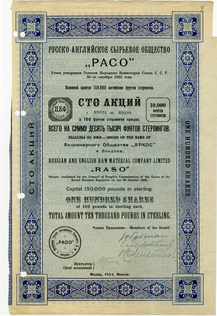 Одним из таких концессионных предприятий было Русско-английское сырьевое общество РАСО, занимавшееся заготовкой и экспортом пушнины. Промысловая пушнина занимала тогда в экспорте страны третье место (до 12%) после зерна и нефтепродуктов.