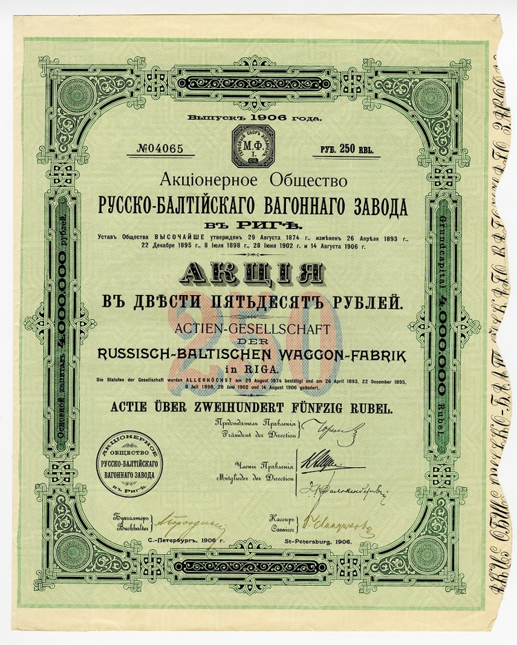 Один из самых «легендарных заводов» отечественной истории, знакомый очень многим еще со школьной скамьи по первому российскому автомобилю, был основан в Риге, в 1869 году в качестве филиала немецкой фирмы по производству вагонов. В 1874 году он получил уже «российское гражданство», будучи преобразованным в «Акционерное общество Русско-Балтийского вагонного завода». Основной капитал общества составлял 9 млн. руб. Вагонная «специализация» предприятия была наиболее известной и востребованной, особенно по номенклатуре, по качеству и количеству товарных вагонов (из производство было в приоритете). И в начале ХХ столетия вагонное производство стало основой для создания монополии «Продвагон». В нее в 1906 году вошел завод в Риге. В том же году был проведен выпуск акций номиналом в 250 рублей. Финансовую поддержку консорциуму оказывал «Русско-азиатский банк».