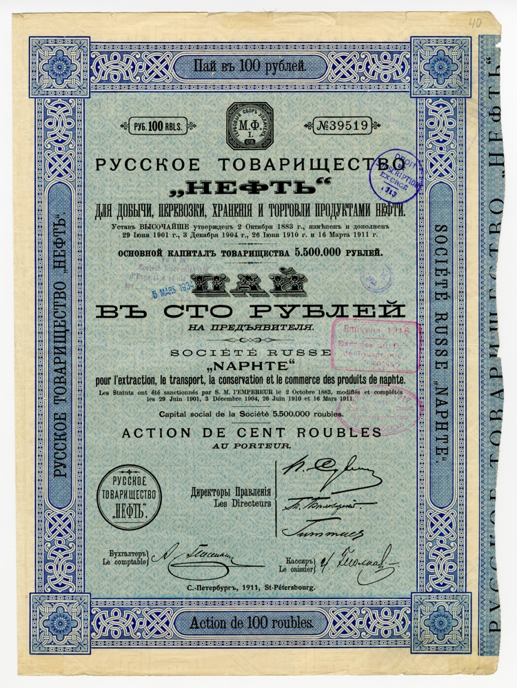 «Русское товарищество «Нефть» для добычи, перевозки, хранения и торговли продуктами нефти» было зарегистрировано в 1883 году в Санкт-Петербурге (Сергиевская ул., 17). Его основной капитал составил 2 млн. руб. Членами правления были А.Е. Сувчинский, Т.В. Белозерский и И.Я. Мирославский. Нефтяные гиганты работали в Бакинском нефтегазоносном районе. Там же добывало нефть и «Русское товарищество». На балансе кампании числились промыслы, оптовые склады, пароходство «Проводник», керосиновый и химический заводы в Баку, 1,5 тыс. цистерн для перевозки нефтепродуктов.