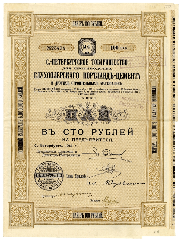 В 1913 году основной капитал «Санкт-Петербургского товарищества для производства Глухоозерского портландцемента и других строительных материалов» был увеличен до 9 млн.руб. путем выпуска дополнительных 30 тыс. паев, распределенных между уже существующими участниками.