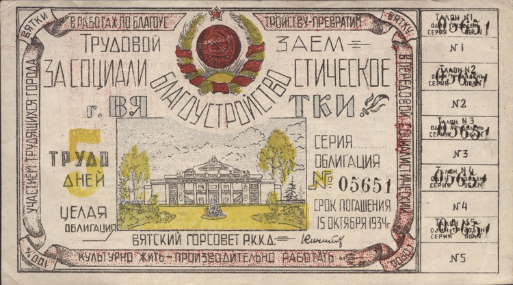 Президиум Вятского городского совета и городского совета профсоюзов также выпустил трудовой заем в количестве 400 тысяч трудодней в облигациях достоинством 5-3-2 трудодней каждая и в двух сериях по видам работ: I серия – выполнение работ по общему благоустройству города, трудоемкостью в 240 тыс. трудодней; II серия – работы по благоустройству территорий своих предприятий и организаций, трудоемкостью в 160 тыс. трудодней. Трудовой займ выпускался сроком на 5 месяцев – с 15 мая по 15 октября 1934 года.