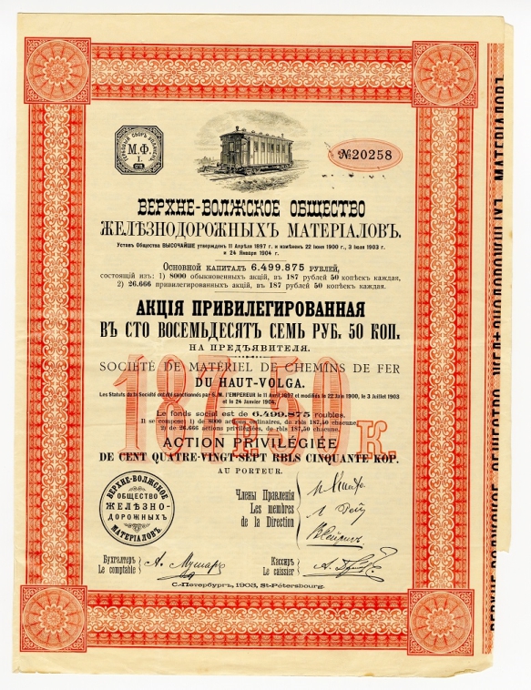 В Высочайше утвержденном 11 апреля 1897 года российском Уставе, отмечалось, что «…Верхне-Волжское Общество железнодорожных материалов» имеет целью содержание и развитие действий, находящегося в городе Твери вагоностроительного завода, равно устройство и эксплуатацию других заводов, изготавливающих пассажирские и товарные вагоны разных типов и всякого рода приспособления и принадлежности, как для подвижного состава, так и для постоянных сооружений дорог паровых, электрических и конных, за сим обработку всякого рода металлов, приготовление из них изделий и торговлю этими изделиями…».