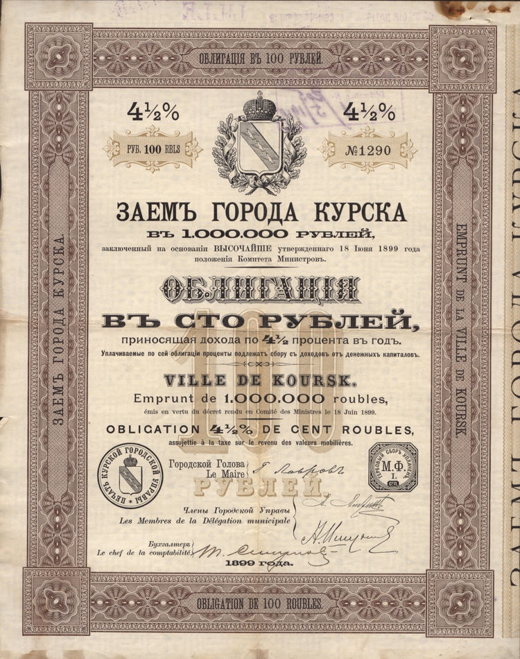 Облигации выпускались на предъявителя номиналом 100, 500 и 1000 рублей. Цель займа – погашение городских долгов, формирование основного капитала городского ломбарда, выкуп в собственность города водопровода, сооружение воинских казарм и складов, постройка торговых лавок. Одной из крупнейших статей расходной сметы была уплата долгов. Главными кредиторами городской казны были иностранные финансисты, которым ежегодно уплачивались десятки тысяч рублей. Почти треть всей городской сметы шла на расквартирование войск. Расходы, которые не всегда своевременно компенсировались казной. А вот социальные объекты были не всегда достаточно финансируемы. В 1899 году пришло время выкупа у акционерного общества водоснабжения и газоосвещения курского водопровода, открытого в 1874 году. Средства, полученные от облигационного займа 1899 года частично пошли на эти цели.