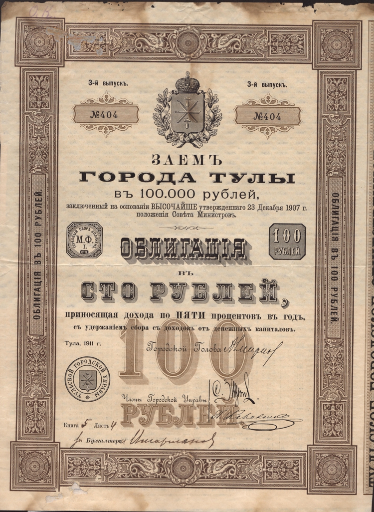 Тула также прибегала к облигационным займам. В 1911 году был утвержден третий выпуск облигационного займа города Тулы в сумме 100 тыс.руб. Облигации номиналом 100 руб. приносили собственникам 5% годовых. С 1911-го по февраль 1917 года главой города Тулы был Аркадий Алексеевич Смирнов, из рода потомственных дворян. При нем открылся театр, была упразднена конно-железная дорога. В годы Первой мировой войны массово были открыты лазареты для раненых.