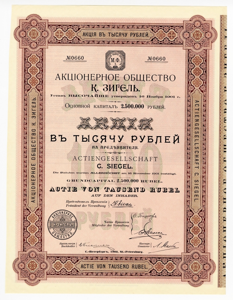 Примером деятельности подобного рода предприятий стал завод Курта Зигеля, начавший свою деятельность в столице Российской империи – Санкт-Петербурге. Уроженец Саксонии Курт Зигель в 1877 году основал небольшой, но очень хорошо оснащенный завод по производству предметов для водоснабжения и газового освещения. Вскоре производственный профиль завода пополнился изготовлением оборудования ванных комнат. Для быстро растущей столицы такая продукция оказалась весьма востребованной.