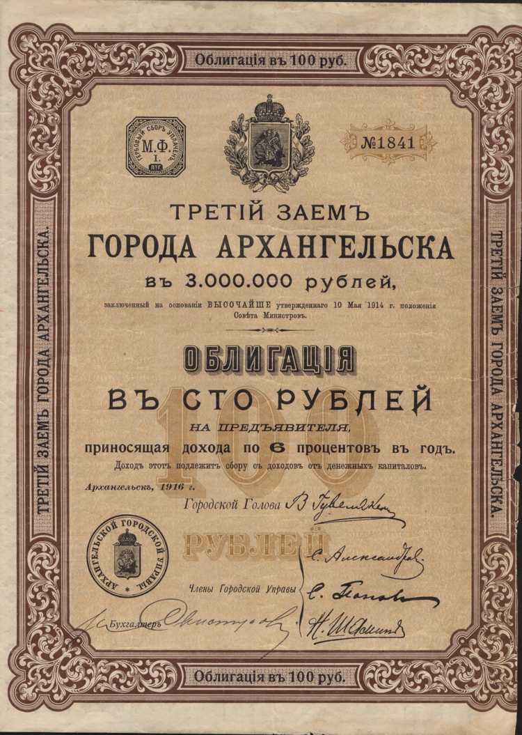 Подобная практика применялась не только на государственном уровне, но и на местах. Так, в Архангельске в 1916 году был выпущен уже третий заем города на сумму 3 млн рублей. Облигации на предъявителя приносили доход 6% годовых. Они выпускались с факсимильными подписями городского головы В. Гувелякена и членов городской управы С. Александрова, С. Попова и Н. Шалита.