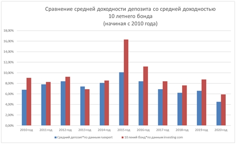 Теперь, когда мы с вами разобрались, из чего именно складывается доходность ОФЗ, давайте посмотрим, как отличается она от депозита. Сравним среднюю ставку по депозитам по годам за 10 лет и доходность десятилетнего бонда за тот же период. Десятилетний бонд – это показатель, который часто используют для статистики доходности по государственным ценным бумагам в международной практике.