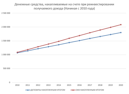 Как видим, сумма, накопленная с помощью ОФЗ выше. За 10 лет вложенный 1 000 000 рублей превратился в 2 086 747 рублей в случае инвестирования в ОФЗ и в 1 802 486 рублей в случае работы с банковским депозитом.