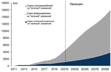 Отсюда, мы ожидаем, что спрос ветроэнергетики на алюминий, вероятно, будет возрастать на 7% ежегодно в течение следующего десятилетия. Также, на долю солнечной энергетики, предположительно, будет приходиться 20% спроса на зеленый алюминий. Это должно произойти в силу того, что потребление энергии растет и, вероятно, продолжит увеличиваться в течение 30 последующих лет, однако странам необходимо снижать выбросы. Отсюда, переход к более экологичному энергоснабжению неизбежен. Вследствие этого, мы предполагаем, что спрос на алюминий для солнечных и ветровых установок продолжит расти, так как он лежит в основе их конструкций и именно на них приходится 90% спроса на возобновляемые источники энергии.