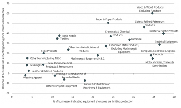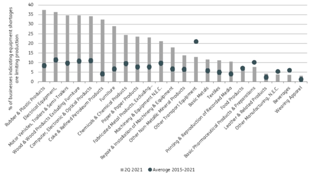 Во многих отраслях промышленности Еврозоны сейчас наблюдается значительная нехватка оборудования. Индекс экономических настроений Еврозоны находится на самом высоком уровне с момента появления индикатора в 1985 г., когда 22,8% предприятий указали на нехватку оборудования как на ключевой фактор, ограничивающий производство.