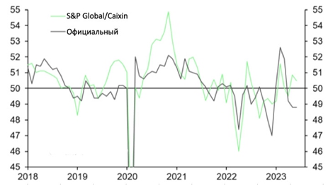Официальные данные и опросы Caixin в обрабатывающей промышленности в прошлом месяце изменились в противоположных направлениях: официальный индекс деловой активности вырос с 48,8 в мае до 49,0 в июне, в то время как индекс деловой активности в обрабатывающей промышленности Caixin снизился с 50,9 до 50,5.