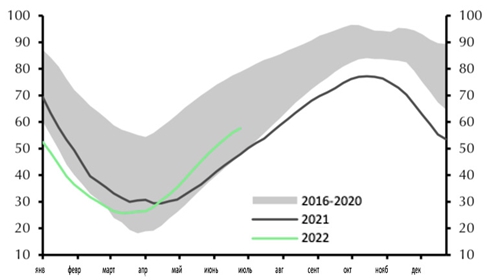 Цены на природный газ в Европе вновь выросли в прошлом месяце, поскольку Россия сократила поставки в Европу. В действительности, в первой половине года наблюдался самый сильный рост цен на энергоносители. Мы ожидаем, что цены снизятся позже в 2022 году, но останутся исторически высокими, поскольку риски и ограничения предложения сохранятся еще некоторое время.
