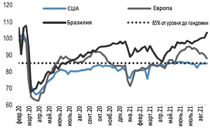 Мобильность в США, Европе и Бразилии в сравнении с уровнем до пандемии