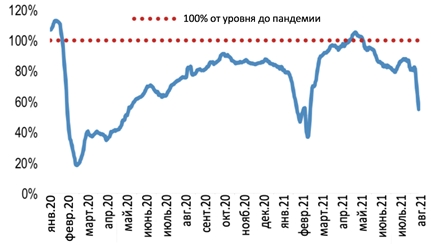 Вследствие этого полетная активность в Китае резко снизилась с конца июля, достигнув примерно 50% от уровня 2019 года во второй половине прошлой недели против 85% в среднем за июль.