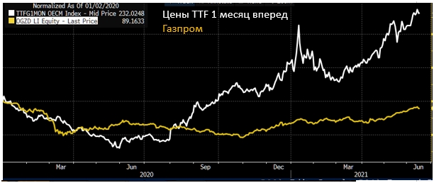 График ниже демонстрирует динамику цен TTF на месяц вперед и цену акций Газпрома в долларах: