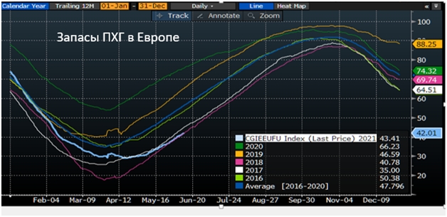 Важным является обстоятельство, что, не смотря на высокие цены и спрос, Газпром не увеличивает поставки через Украину (утилизация маршрута всего около 30%), что находит отражение в низком уровне наполненности ПХГ.