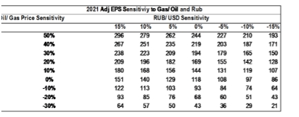 - Как для экспортера, прибыль Газпрома имеет достаточно высокую чувствительность к курсу рубля. Так, укрепление рубля на 5% может привести к, примерно, 8% снижению прибыли (оценка JPM)