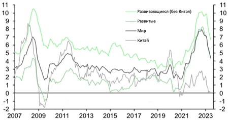 Снижение глобальной инфляции, вероятно, должно продолжаться и в дальнейшем. В то время как падение пока в основном отражало более низкую инфляцию цен на энергоносители, более низкая базовая инфляция должна сыграть большую роль в предстоящем году. Уже есть признаки того, что инфляция по основным товарам продолжит замедляться, а слабый рост в развивающихся странах и умеренный спад в развитых также должны оказать давление на инфляцию в сфере услуг. В целом, мы считаем, что глобальная инфляция стабилизируется на уровне порядка 3%, который был до пандемии, к 2025 году.