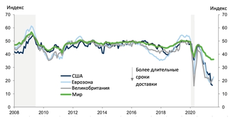 Глобальные задержки с поставками продукции значительно увеличились до экстремальных уровней, особенно в США и Европе. Проблемы с цепочками поставок существенно повлияли на понижение прогнозов роста в США на 2 и 3 кварталы 2021 года и привели к серьезным неожиданностям, связанным с ростом инфляции в мире.