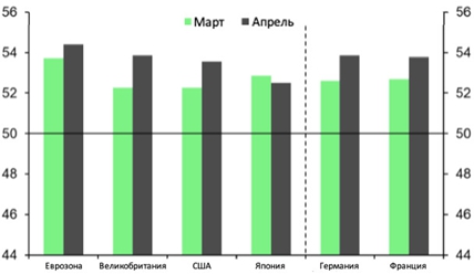 На фоне недавнего роста активности и относительно позитивного прогноза для сектора услуг индекс деловой активности также указал на дальнейший рост занятости. Сводный индекс деловой активности в сфере занятости вырос во всех основных странах с развитой экономикой в апреле, чему способствовал более сильный рост числа рабочих мест в секторе услуг.