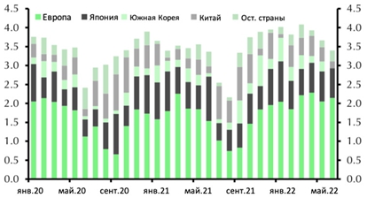 Но, возможно, более интересным является резкое сокращение импорта СПГ в Азию. Большая часть данного снижения может быть объяснена падением импорта Китая на 22% в годовом исчислении в январе-июне, что, по нашему мнению, отражает снижение спроса из-за низкой экономической активности и ограничений, связанных с коронавирусом. Также наблюдается увеличение импорта трубопроводной продукции из России и восстановление гидроэнергетики. Мы ожидаем некоторое увеличение импорта СПГ в Китай позже в этом году и, что сокращение в 2022 году составит около 15%.