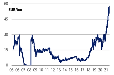 Более того, как и ожидалось, Комиссия включила Механизм корректировки углеродных границ (CBAM), который будет облагать налогом импорт в углеродоемких секторах, таких как сталь, цемент и удобрения, из стран с более низкими экологическими стандартами, чем в ЕС. С учетом того, что объем бесплатных ассигнований будет снижаться на 10% в год, начиная с 2026 года, и достигнет нуля к 2035 году, CBAM, похоже, станет инструментом будущего. Изменения начнутся в 2023 году с переходного периода до 2025 года, в течение которого импортеры будут нести значительные обязательства по отчетности. Начиная с 2026 года импортеры должны будут приобретать сертификаты CBAM по еженедельной средней цене EUA, чтобы покрыть свои выбросы углерода при импорте.