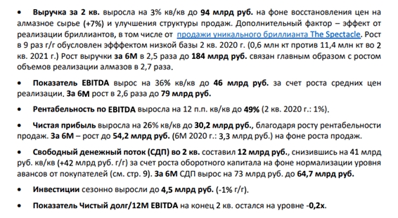 • Компания “Алроса” также представила свою отчетность за 1 полугодие 2021 года. Дивиденды по итогам полугодия составят 8,79 рублей на акцию и доходность составит 6,06%.