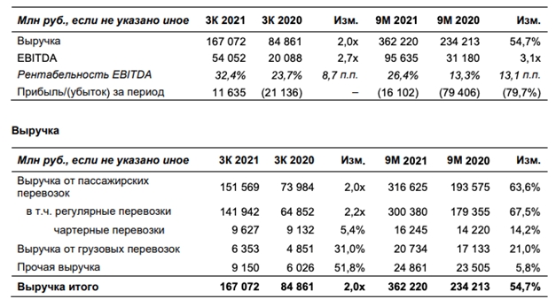 29 ноября Аэрофлот представил отчетность по МСФО по итогам 3 квартала 2021 года. Показатели значительно улучшились. Выручка компании за 3 квартал составила 167,072 млрд руб. против 84,861 млрд руб. годом ранее. Показатель EBITDA увеличился в 2,7 раза до 54,052 млрд руб. Чистый убыток компании по итогам 9 месяцев 2021 года составил 16,102 млрд рублей в сравнении с 79,406 млрд рублей годом ранее.