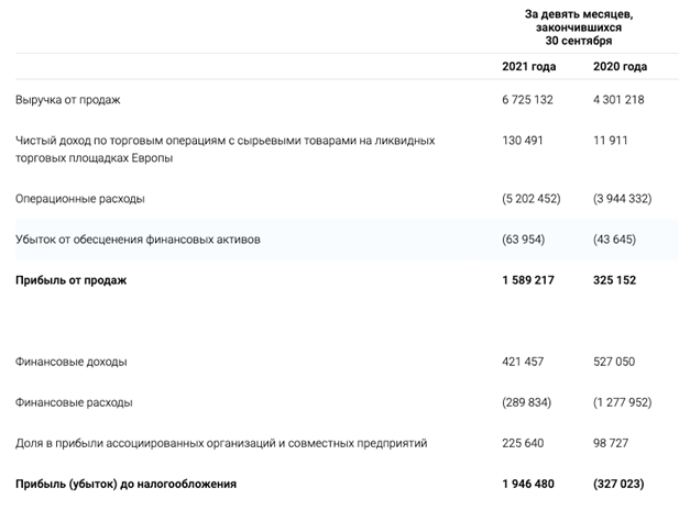 29 ноября компания Газпром представила финансовую отчетность по итогам 3 кварталов 2021 года. За девять месяцев чистая прибыль компании составила 1, 55 трлн руб. против 218,4 млрд руб. убытка годом ранее. Показатель EBITDA на 137% за девять месяцев по сравнению с годом ранее и составил 2, 213 трлн руб. Данное изменение в основном связано с увеличением выручки от продаж.