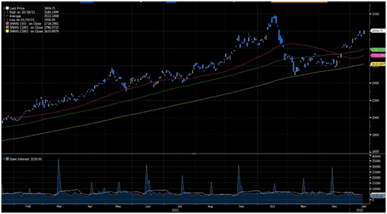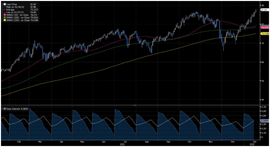 В то же время, несмотря на геополитическую напряжённость, цены на нефть остаются на уровне 85 – 87 долларов и практически не корректируются. Стоит отметить, что ранее на рынке ожидался профицит в 2022 году в силу продолжения наращивания добычи ОПЕК+ и ожиданий по снижению спроса. Однако, значительных изменений спроса на нефть не произошло, так как новый штамм “Омикрон” оказался легко переносимым и жестких локдаунов введено не было.