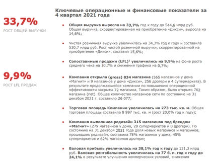 “Магнит” представил отчетность по итогам 4 квартала 2021 года. Финансовые результаты очень сильные: увеличилась маржа, что является позитивом на фоне того, что компания стала более активно и эффективно работать со случайной порчей товара. Также “Магнит” заявил, что они в отличной позиции: общая выручка возросла на 33,7%, что также предполагает увеличение размера выплачиваемых дивидендов.