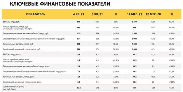 “Росфнеть” также опубликовала финансовую отчетность по итогам 2021 года. Год стал рекордным, однако показатели могли быть и лучше. Показатель EBITDA в 4 квартале вырос на 6% до 676 млрд рублей в сравнении с кварталом ранее, в то время как га год данный показатель достиг уровня в 2330 млрд рублей. Чистая прибыль по итогам 2021 года достигла 883 млрд рублей в сравнении со 132 млрд годом ранее. В целом, отчётность сильная, но особого прорыва не произошло.